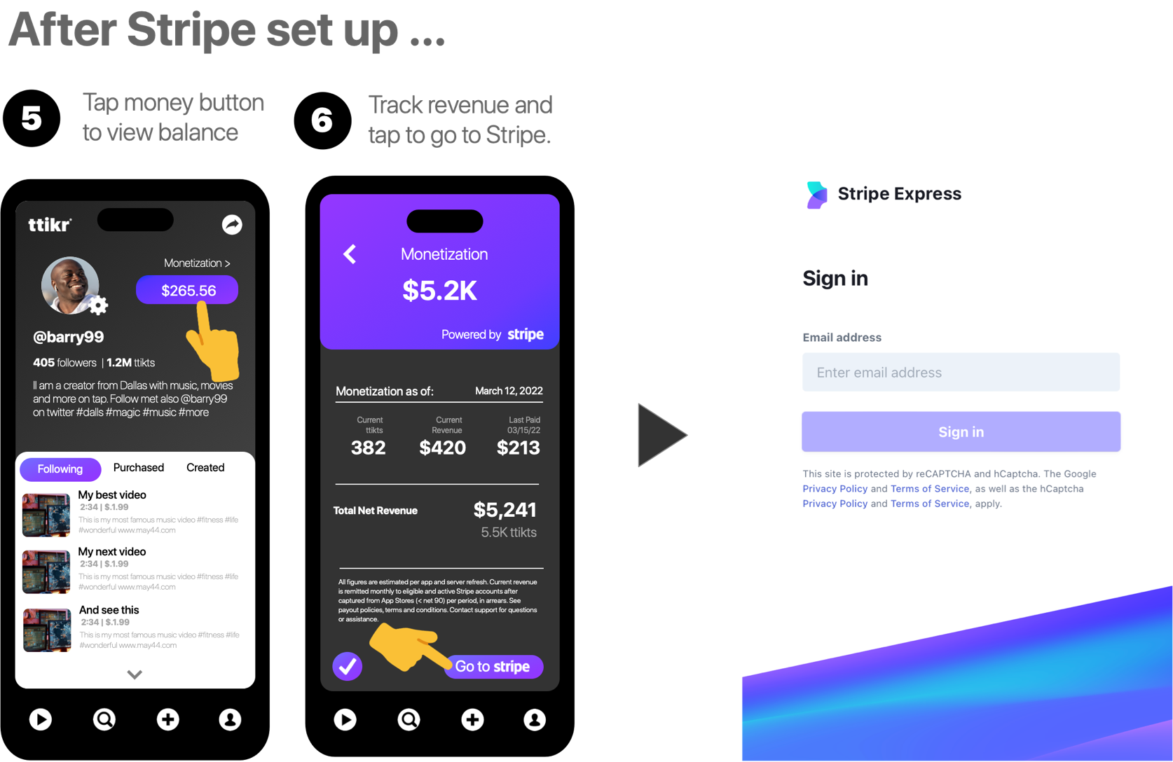 After, tap the ttikr® monetization button to check your balance or visit Stripe to manage payouts.