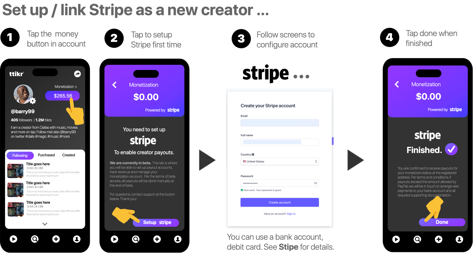 To get paid with ttikr®, creators need to setup or link a valid Stripe account.You can set up a new account or link to an existing one from within the app by tapping the monetization button and following the prompts. For questions, see ourFAQ or contactsupport. For questions regarding Stripe account requirements and eligibility, visit www.stripe.com.
